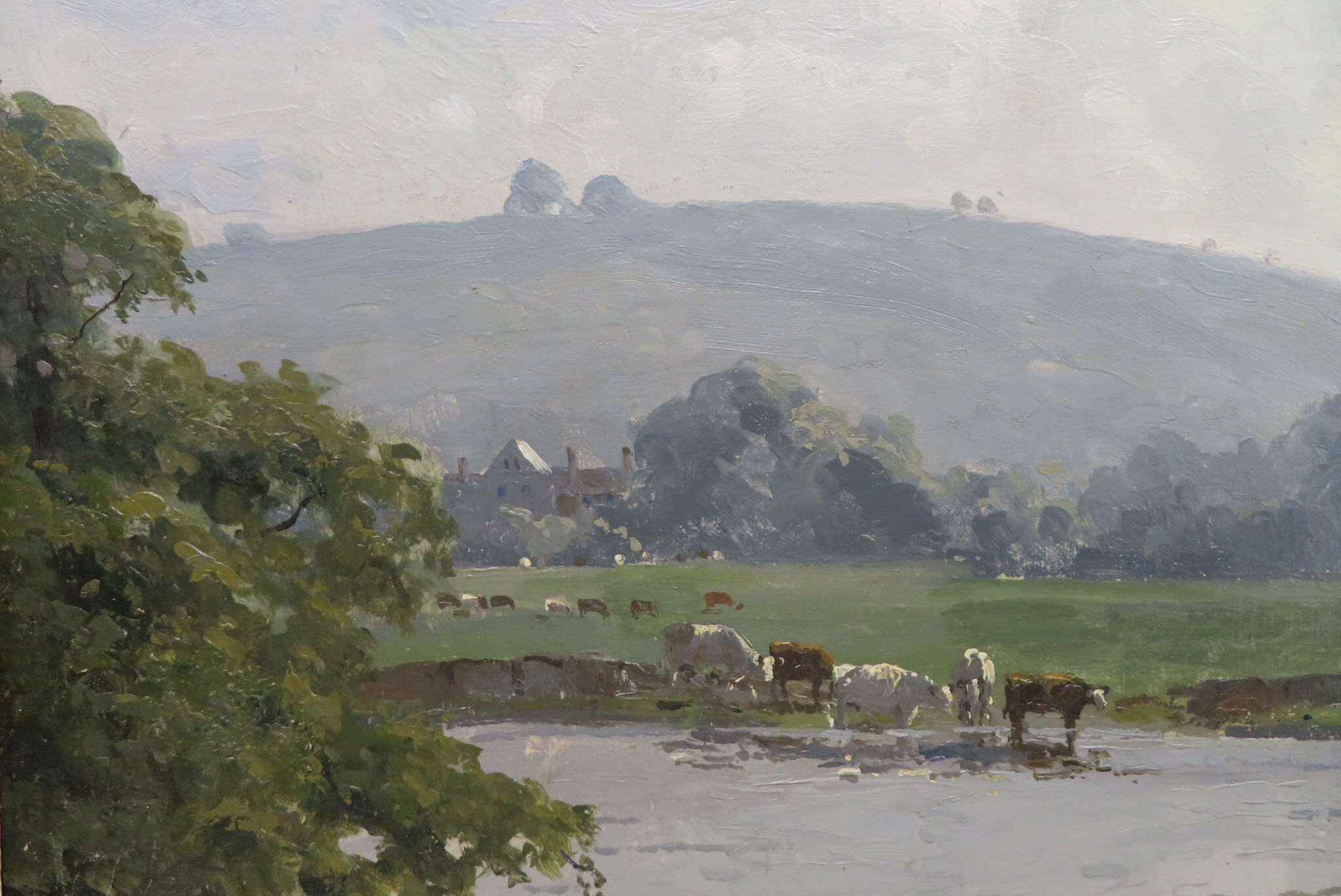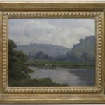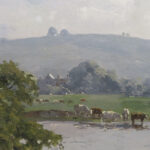 DETAIL: Campbell Archibald Mellon was born in Berkshire on June 16th 1878, but showed little aptitude for painting at school and it was not until 1903, when his business career took him to Nottingham, that he first began to paint seriously. He was fortunate in being taken under the wing of Carl Brenner, a nephew of Benjamin Williams Leader R.A. After the First World War, in which he served gallantly, albeit reluctantly for he had strong pacifist sympathies, he and his young bride moved to the seaside township of Gorleston, Norfolk. This was a turning point in his life. It was here that he met Sir J.S. Arnesby Brown, then at the peak of a creative ability which was soon to be curtailed by approaching blindness. There was a great affinity between the two men and the encouragement and tuition Mellon received from him dictated the path he was to follow. Nevertheless, he refused to permit his own individual spark to be extinguished by the other’s genius. His first picture to be exhibited at the Royal Academy, in 1924, was a beach scene entitled ‘Yarmouth – August Bank Holiday’. From 1924 (when he was 46) until 1955, Mellon was a regular exhibitor at the Royal Academy and had more than 50 canvasses hung in the Society’s prestigious galleries. The first picture attracted considerable attention by reason of the myriad’s of tiny but clearly defined figures dotted all over the beach. They were executed with a deftness unique to Mellon and in picture after picture busy little figures loved to paint the beach at Gorleston while looking into the sun. The play of light on sand and water fascinated him. His skies are never a matter of perfunctory filling-in and, whether an untroubled blue or heavy with huge cumulus clouds, they are an integral and often dramatic part of the composition. In 1938 Campbell Archibald Mellon was elected a member of the Royal Society of Oil Painters and of the Royal Society of British Artists the following year. He was bombed out of his home in Gorleston in 1940 and settled in the Wye Valley near Symonds Yat. At the end of the war Mellon went back to Gorleston and continued to paint the beaches and countryside he knew so well. Mellon continued to paint avidly and exhibited in most of the important shows. His pictures are to be found in the public galleries of Bristol, Sheffield, Leeds and Great Yarmouth. He died in Gorleston on August 28th, 1955.