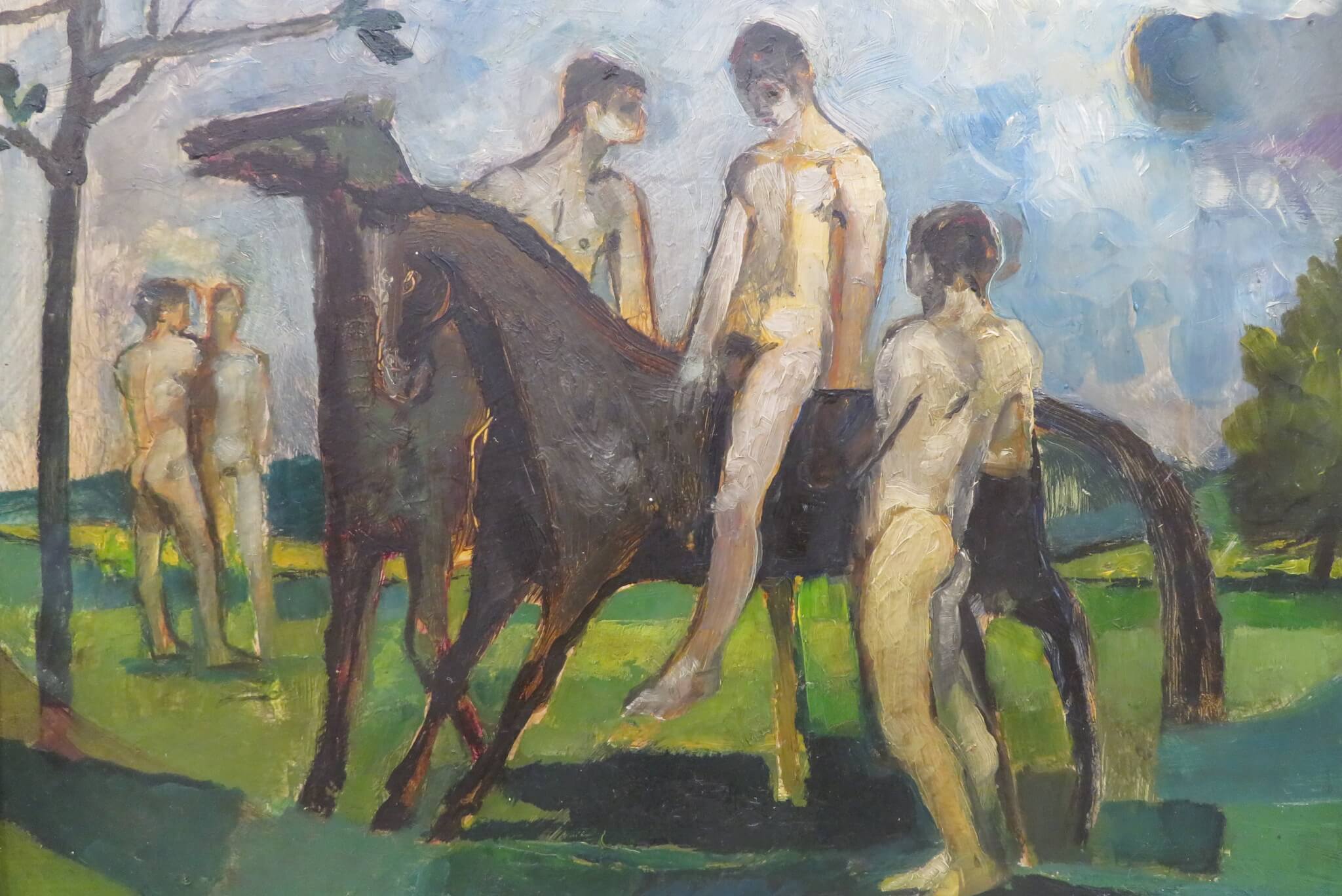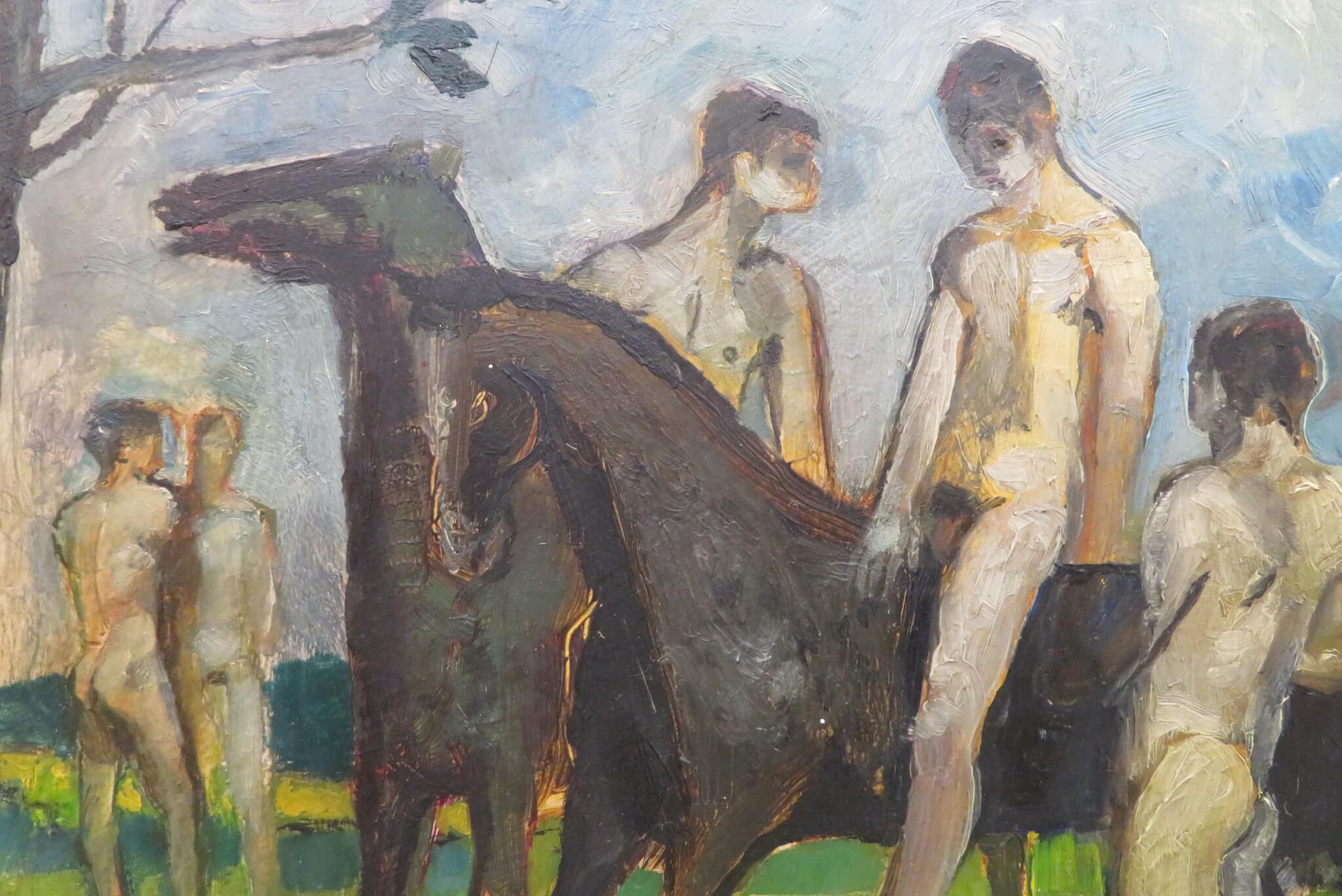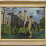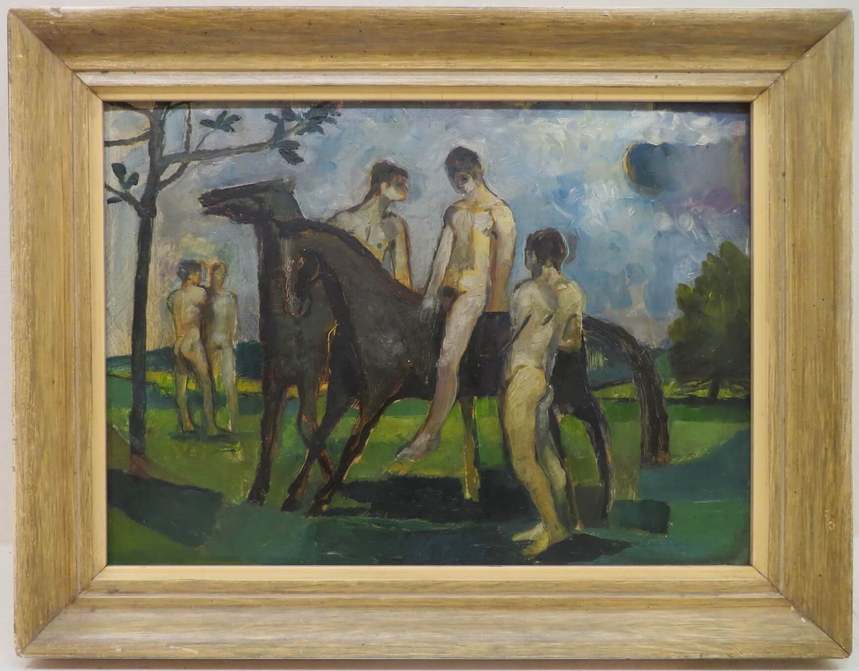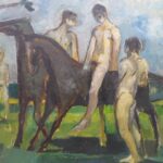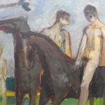 DETAIL: Born in 1935 in Stepney London into a family of Irish Catholic and Eastern European immigrants he ultimately became one of the top painters of the make form working in Britain in the second half o the 20th Century. He trained at Goldsmiths College in the 1950’s and was greatly influenced by the British artist Keith Vaughan with many of his early work showing the influence – as can be seen here. His paintings range from the shockingly abstract to vaguely cubist or displaying a sense of brilliant realism. Like all great artists his works tell a story and often his are of powerful male encounters.