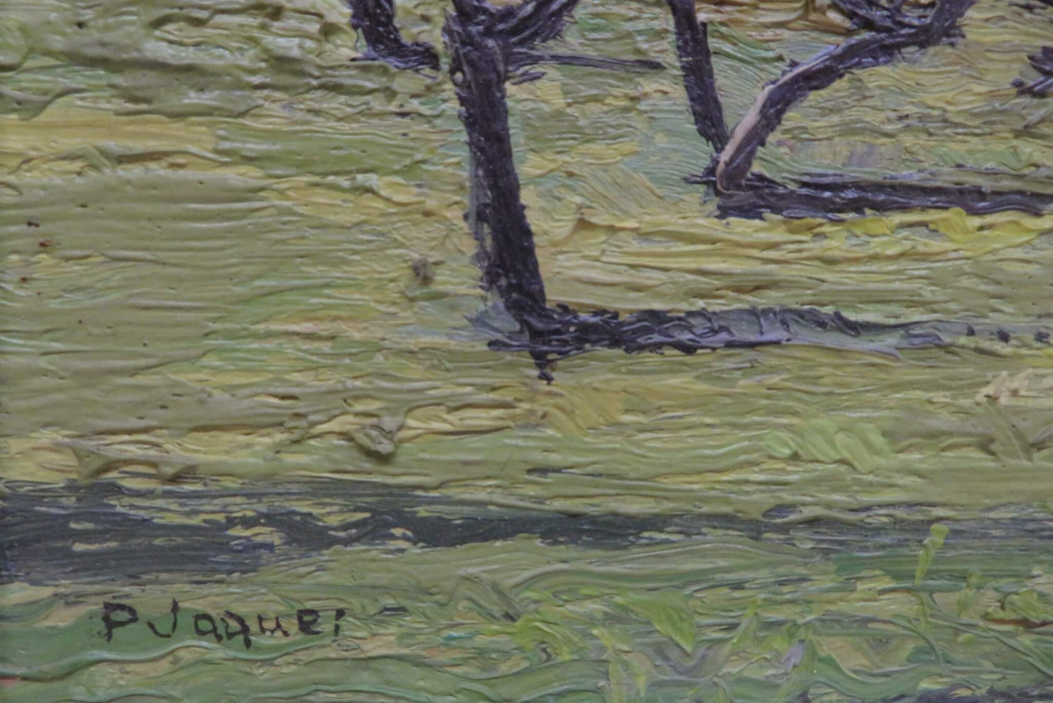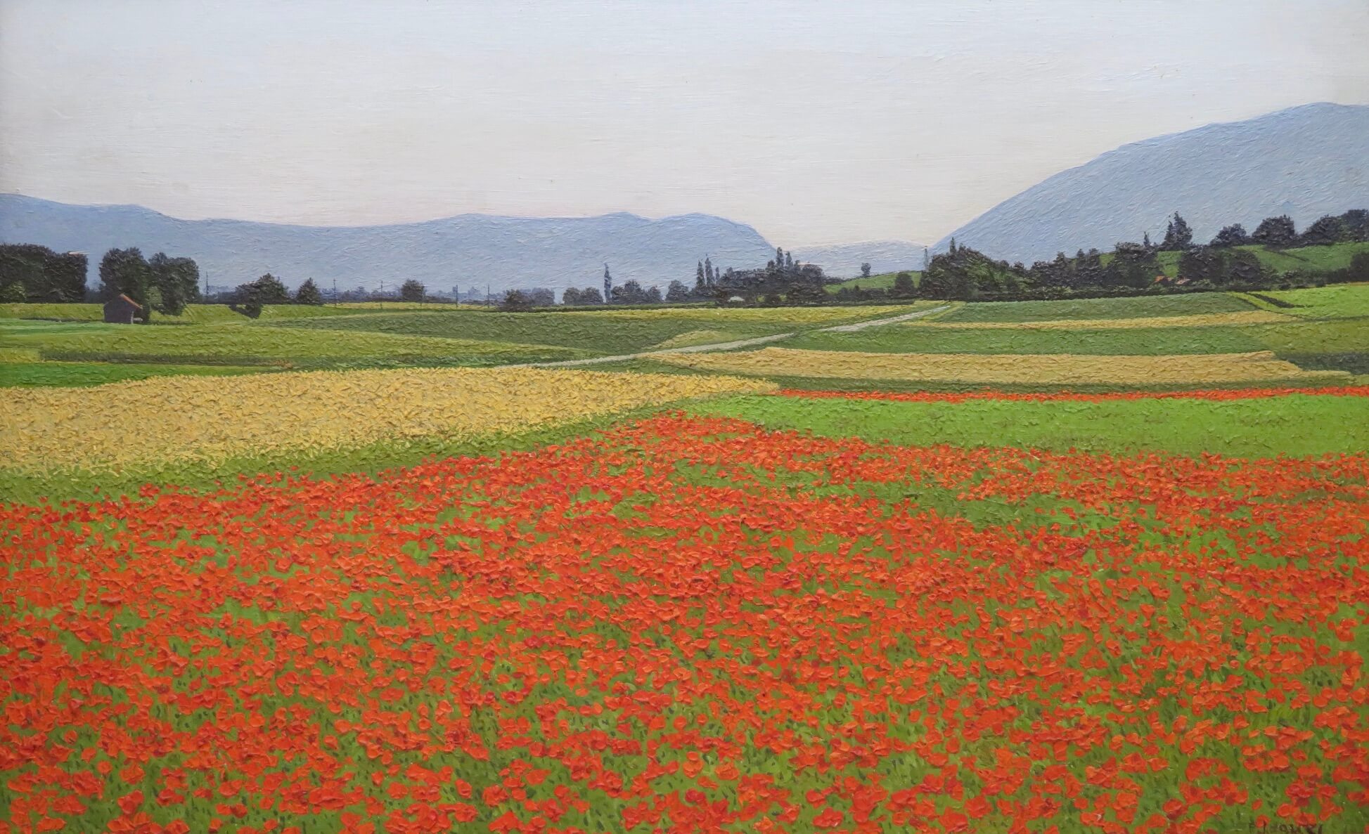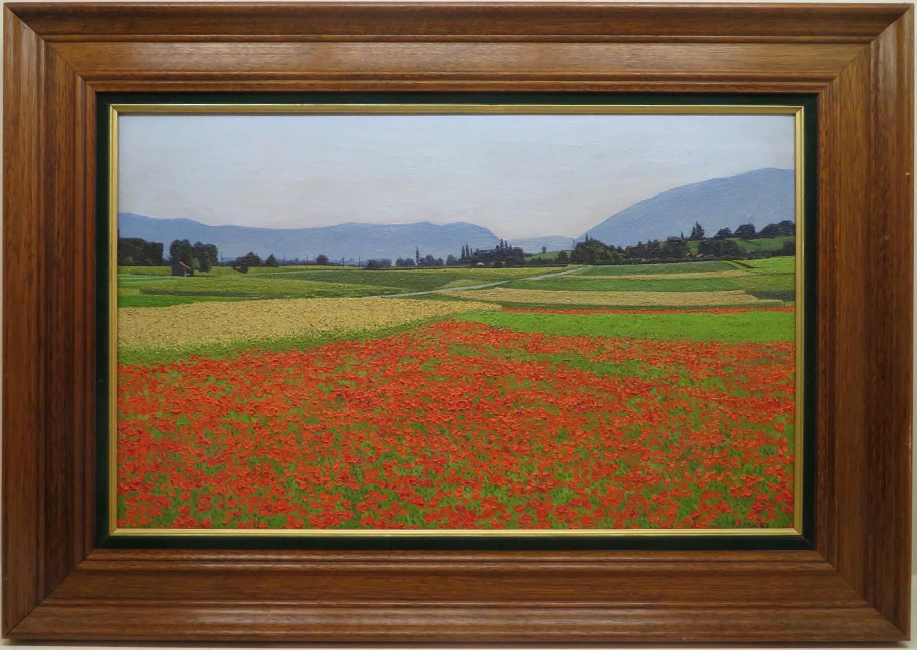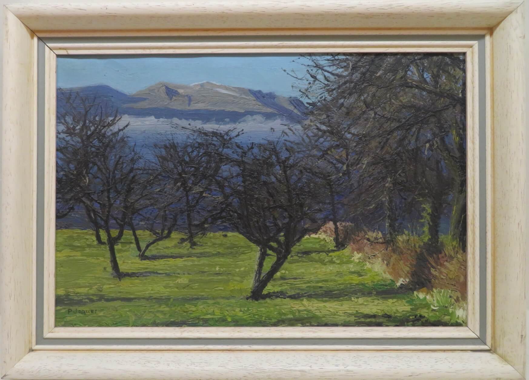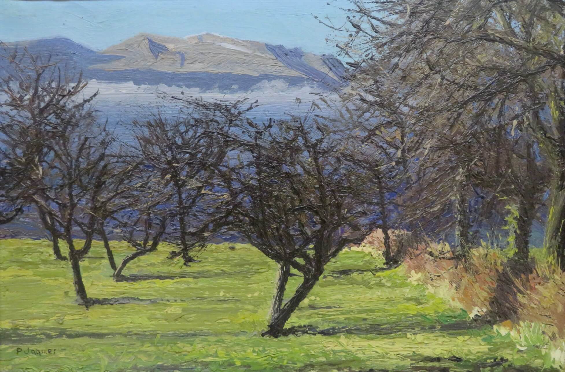 DETAIL: Jaques was born on December 15, 1913 in Yverdon in Switzerland, at a place called Ste-Croix. From his early childhood, he paints and draws. When he was 16, his parents directed him to the Ecole des Arts Industriels de Genève where he learned, for four years, painting and sculpture in decoration and interior architecture. Then he entered the Ecole des Beaux Arts in Geneva in the studio of Alexandre Blanchet, whom he considered to be his true master. A meeting with the painter Adrien Holy opens up new horizons for him. He then completed his artistic training during trips to Venice, Florence, Paris and Madrid. Besides lucrative activities, he painted and exhibited in Zurich and Bern, where he obtained two federal scholarships for Fine Arts, and in Geneva. In 1954, he met Max Moos, the well-known talent scout. He exhibits regularly in his gallery on the quai du Mont-Blanc in Geneva. This collaboration will last 25 years. During this period, Max Moos organized, for him, exhibitions in the United States and Canada, under the theme “Return to nature”. From 1941, Pierre Jaques also made numerous exhibitions in Switzerland, Geneva, at the Rath Museum and at the Athénée in particular, in Morges, Hermance, Carouge.Pierre Jaques has a predilection for the Pays de Gex and in particular for Versonnex where he settles in 1968; he remained there until the end of his life in 2000. He painted many landscapes of the region, still lifes, nudes and portraits.Pierre Jaques has participated in the artistic life of Versonnex since 1975. He has exhibited every year at the Salon d’Automne in Saint-Martin, since its creation in 1982. In 1996, he was the Guest of Honor of this exhibition. He opened his personal gallery to artists on several occasions, in particular in 1980 and 1988, in order to allow the restoration of the stained glass windows and the creation of an Aubusson tapestry for the church of Versonnex.Pierre Jaques’s painting is easy to read, the result of careful and uncompromising observation of nature. The writing is simple, supported by a very present drawing. The color comes alive without breaking the harmony or modifying the composition.Pierre Jaques was not only a talented painter, but also an affable man, a wise man, willingly disposing of his time to listen and encourage the artists who came to see him and ask him for advice.When in 1936, Pierre Jaques graduated from the School of Fine Arts in Geneva with honors, he traveled throughout the Geneva basin with a clear predilection for the foot of the Jura. But it was quickly towards the Pays de Gex that he turned and painted until his death. He knows every nook and cranny of it to such an extent that his friends nickname our region, “the Land of Jaques”. When, at the end of the 1960s, he and his family had to leave his house in the Montbrillant district, which was set to be demolished, it was only natural that he directed his research towards the Pays de Gex. He finally finds the place of his dreams: a house surrounded by orchards, the famous house of Versonnex, a meeting place for painters who have come to ask him for advice.