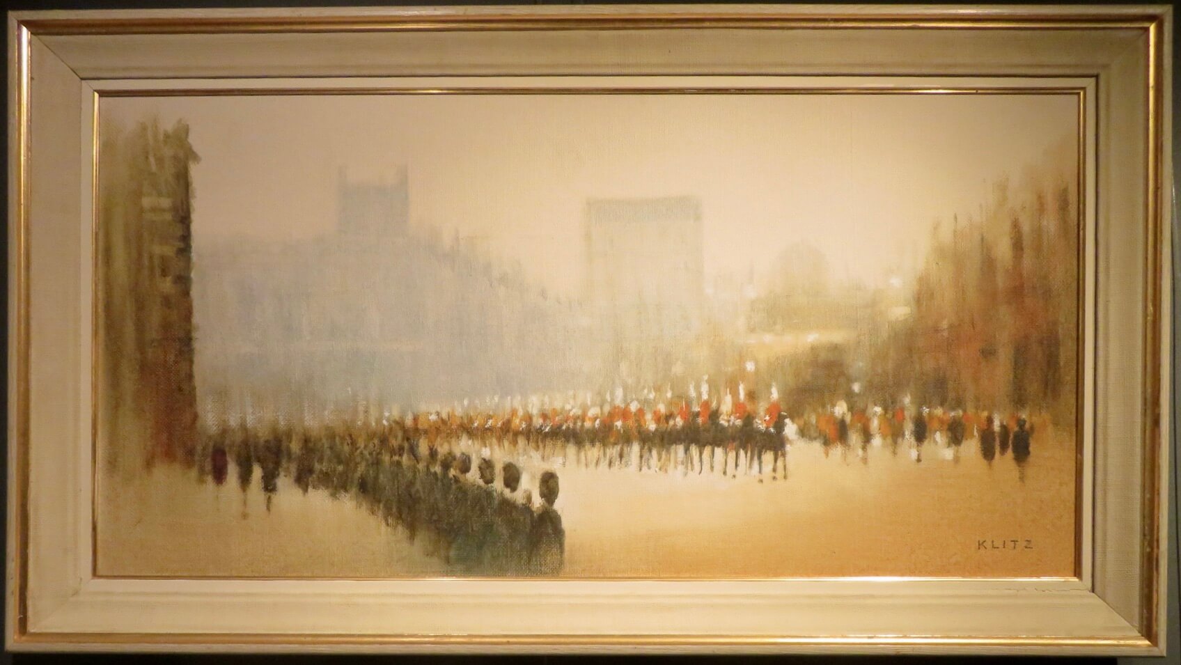 DETAIL: The work depicts the Changing Of The Guard The Mall in London. The size is impressive at nearly 1.2m long and in its original very nice Klitz frame with his stamp verso. Anthony Klitz born September 3rd 1917, in Southport Merseyside and attended Bishop Wordsworth School, Salisbury before studying painting and drawing at Cheltenham Art College (1936-1939). He also received training as an architect. Klitz served in the War, ending up as a Major, and in 1950 moved to London where he painted alongside the Australian artist Hayward Veal where he began exhibiting his impressionist work. He passed away on September 19th 2000, in Dublin.